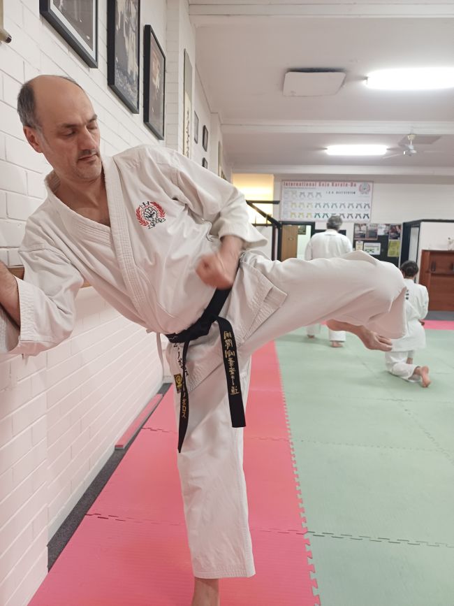 Lower stances demand strength to support the pelvis and knees. Turning in kata requires lateral control. One-leg positions require stability. Kicks require a dependable base.